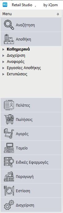Για να μεταβείτε σε ένα από τα βασικά υποσυστήματα της εφαρμογής (Αποθήκη, Πελάτες, Πωλήσεις, Αγορές, Ταμείο, Ειδικές Εφαρμογές, Διαχείριση) κάνετε κλικ πάνω στο αντίστοιχο όνομα. Κάθε υποσύστημα ανοίγει με τα περιεχόμενά του στο επάνω αριστερό τμήμα της εφαρμογής.