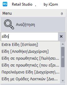 Στο μενού Αναζήτηση μπορείτε να αναζητήσετε οποιοδήποτε μενού της εφαρμογής. Για παράδειγμα εάν πληκτρολογήσετε στο πεδίο «είδη» εμφανίζονται τα μενού που περιέχουν τη λέξη «είδη» και από δίπλα η διαδρομή γι’ αυτό το μενού.