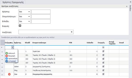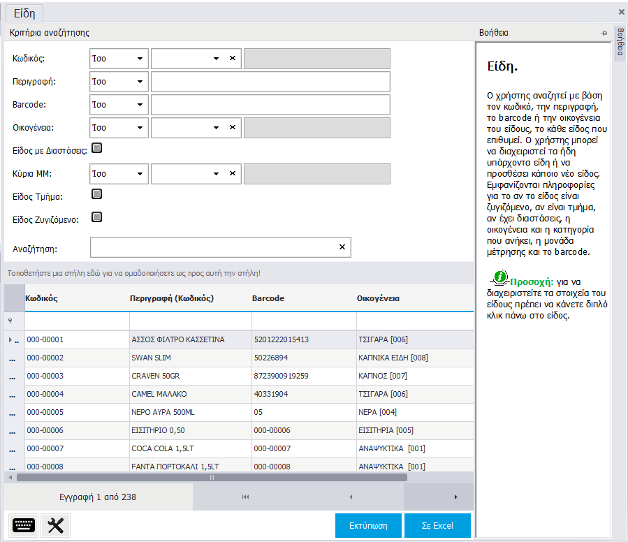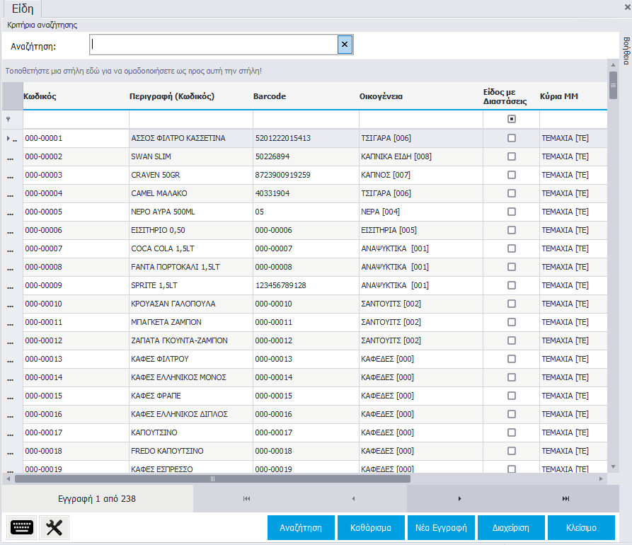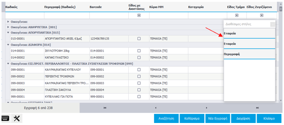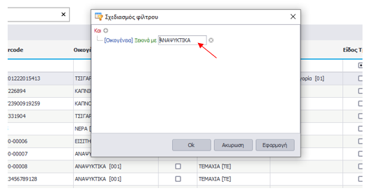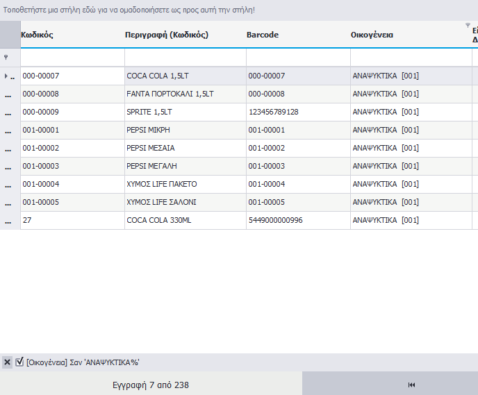 Διαχείριση Φίλτρων: Υπάρχει η δυνατότητα εμφάνισης εγγραφών με χρήση φίλτρων. Για παράδειγμα, για να εμφανίσετε στον πίνακα αποτελεσμάτων μόνο τα είδη που ανήκουν στην οικογένεια ΑΝΑΨΥΚΤΙΚΑ, πατάτε δεξί κλικ στη στήλη «Οικογένεια», επιλέγετε «Διαχείριση Φίλτρων» και στην οθόνη που εμφανίζεται πληκτρολογείτε «ΑΝΑΨΥΚΤΙΚΑ».
