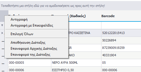 Με δεξί κλικ επάνω σε κάποια στήλη εμφανίζονται οι εξής επιλογές: