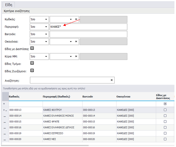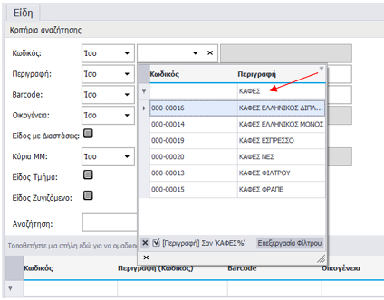Για παράδειγμα, εάν ξέρετε ότι η περιγραφή του είδους ξεκινάει από «ΚΑΦΕΣ», πληκτρολογείτε «ΚΑΦΕΣ» και εμφανίζονται τα αντίστοιχα είδη.