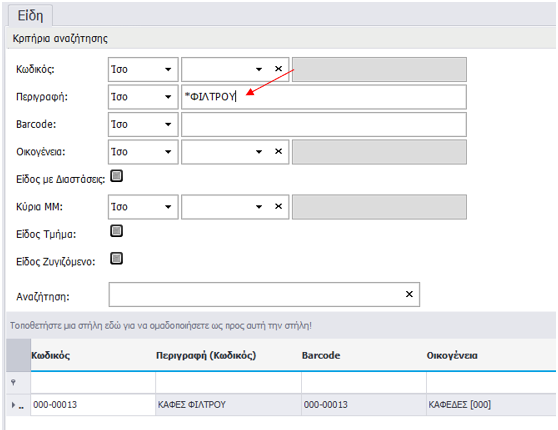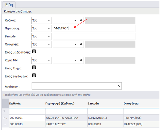 Εάν ξέρετε ότι η περιγραφή του είδους τελειώνει στη λέξη «ΦΙΛΤΡΟΥ» πληκτρολογείτε «*ΦΙΛΤΡΟΥ».