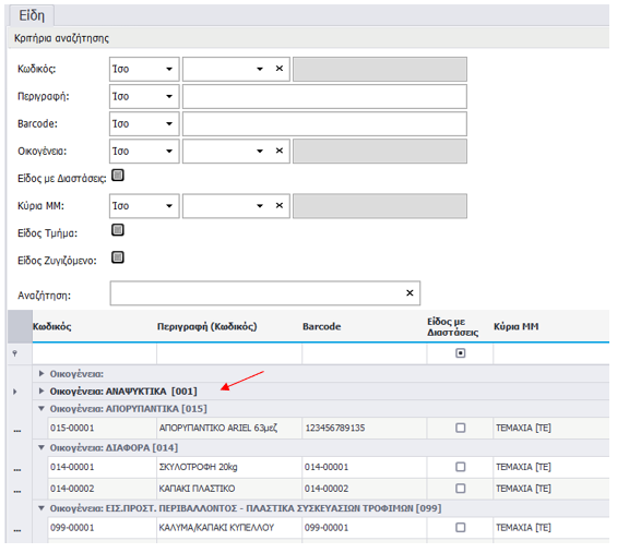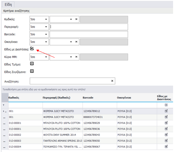 Εάν για παράδειγμα επιλέξετε το πεδίο «Είδος με Διαστάσεις» και πατήσετε Αναζήτηση εμφανίζονται μόνο τα είδη με διαστάσεις.