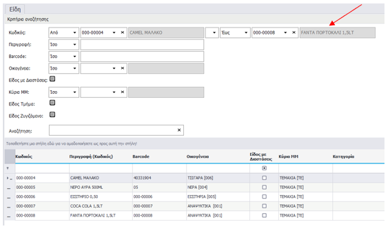 Για παράδειγμα, μπορείτε να αναζητήσετε συγκεκριμένο εύρος κωδικών ειδών. Στο πεδίο Κωδικός επιλέγετε «Από» το είδος «000-00004» και «Έως» το είδος «000-00008».
