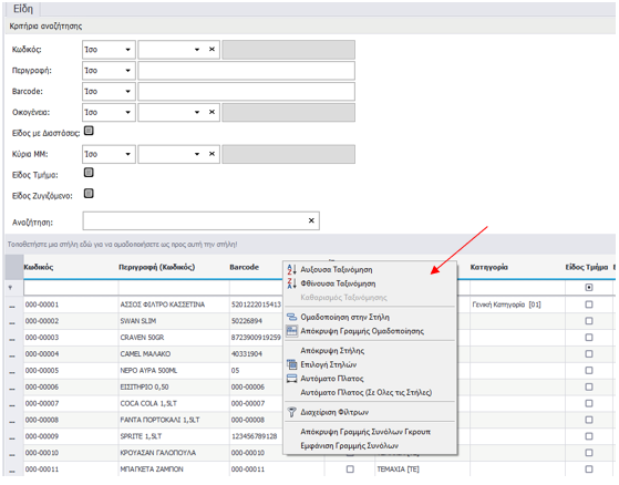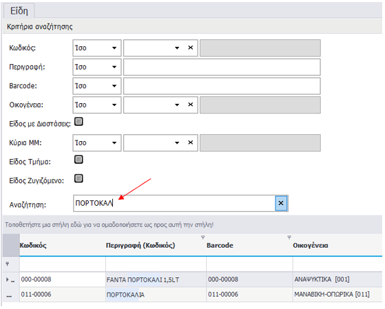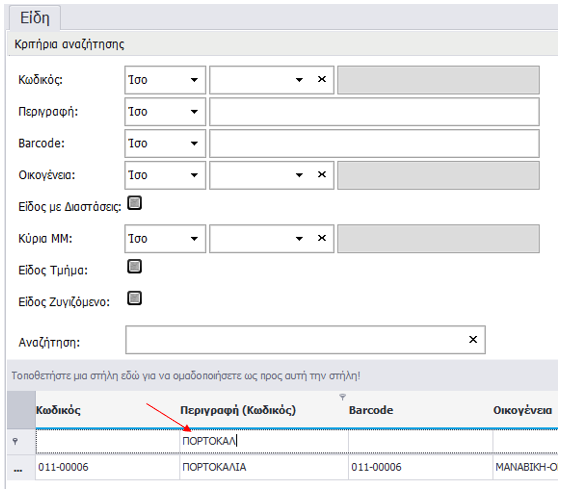 Στο κριτήριο Αναζήτηση μπορείτε να αναζητήσετε οτιδήποτε πληκτρολογήσετε στο πλαίσιο. Για παράδειγμα, εάν αναζητήσετε τις περιγραφές των ειδών που περιέχουν το «ΠΟΡΤΟΚΑΛ» εμφανίζονται τα είδη που περιέχουν το συγκεκριμένο λεκτικό.