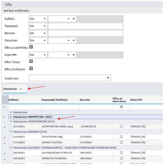 Πατάτε «Οκ» και εμφανίζονται μόνο τα είδη που ανήκουν στη συγκεκριμένη οικογένεια.