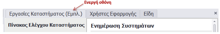Από το μενού της Εφαρμογής ανοίγετε τη κάθε οθόνη κάνοντας κλικ πάνω στο όνομά της. Υπάρχει η δυνατότητα να είναι ανοιχτές πάνω από μια οθόνες κάθε φορά, αλλά μόνο μια να είναι ενεργή. Επιλέγετε την οθόνη που θέλετε να είναι ενεργή από τις ανοιχτές οθόνες κάνοντας κλικ στο τίτλο της. Το σύστημα φορτώνει τη συγκεκριμένη οθόνη και το χρώμα φόντου της αλλάζει.
