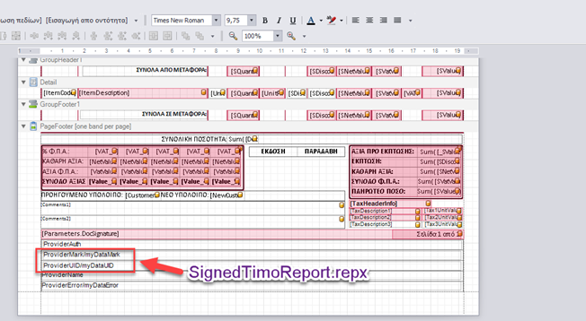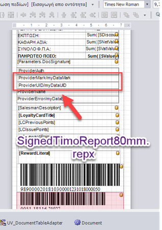 - Αν η φόρμα περιλαμβάνει τα πεδία ProviderMark/myDataMark και ProviderUID/myDataUID. Στις περιπτώσεις που δεν υπάρχουν, τα προσθέτουμε (με copy / paste) από τις συστημικές φόρμες της εφαρμογής SignedTimoReport80mm.repx και SignedTimoReport.repx.