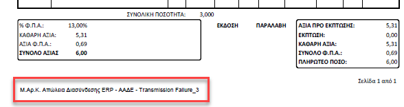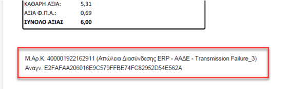 Ο λόγος που πρέπει να γίνει το παραπάνω, αν και δεν είναι υποχρεωτική η εκτύπωση του Μ.ΑΡ.Κ και UID που περιέχουν τα πεδία αυτά, στην περίπτωση σφάλματος κατά την αποστολή στο myDATA, στο πεδίο ProviderMark/myDataMark θα εμφανιστεί το σφάλμα «Απώλεια Διασύνδεσης ERP – ΑΑΔΕ – Transmission Failure_3», το οποίο είναι υποχρεωτικό να εκτυπώνεται σε αυτές τις περιπτώσεις.