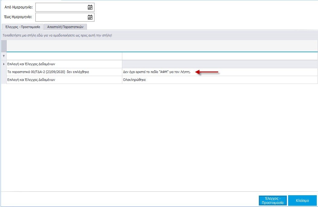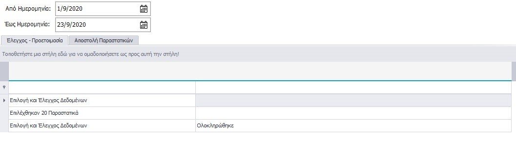 Για την εκκίνηση της εργασίας πατάμε το «Έλεγχος – Προετοιμασία». Με αυτή την εργασία γίνεται αναζήτηση των παραστατικών που αφορούν την πλατφόρμα myDATA για το ημερολογιακό διάστημα που ορίσαμε. Σε αυτή την αναζήτηση πραγματοποιείται έλεγχος από το RetailStudio για τυχόν ελλείψεις στην παραμετροποίηση μας, βάση των προδιαγραφών όπως αυτές ορίστηκαν από την myDATA.