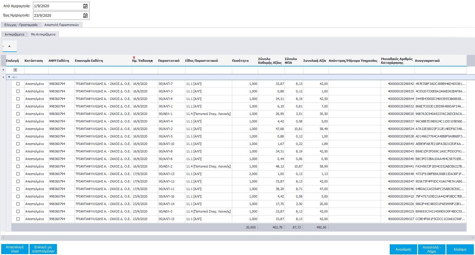 Εφόσον διορθώσουμε τα σφάλματα που προέκυψαν, ξαναπατάμε το κουμπί «Έλεγχος – Προετοιμασία» και μετά ξανά «Αποστολή – Λήψη». Αν η Υπηρεσία λάβει επιτυχώς όλες τις εγγραφές μας, θα πρέπει όλες να έχουν status Απεσταλμένο και συμπληρωμένες τις στήλες «Μοναδικός Αριθμός Καταχώρισης» και «Αναγνωριστικό».