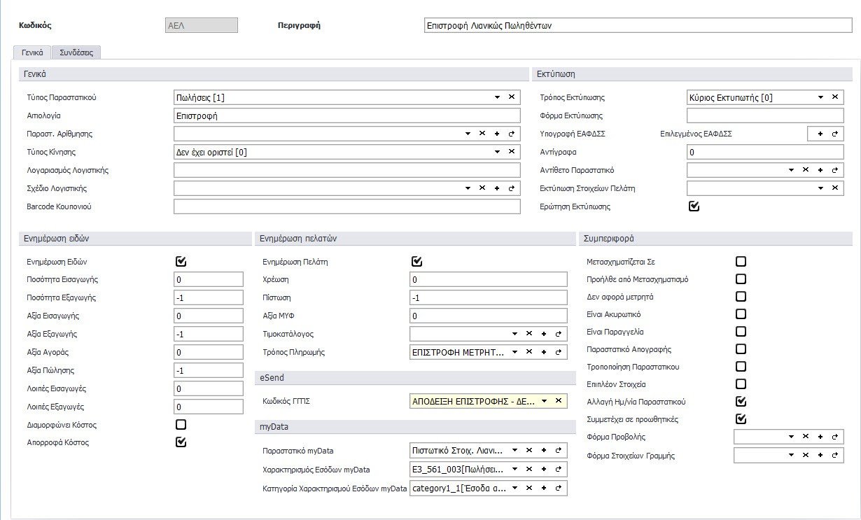 Παράδειγμα παραμετροποίησης παραστατικού Επιστροφής Λιανικώς Πώληθέντων