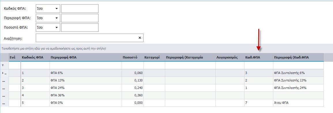 4. Θα πρέπει να συμπληρωθεί ο σχετικός κωδικός ΑΑΔΕ για τα ΦΠΑ που χρησιμοποιεί η εταιρία ( Διαχείριση\ Μαζική Διαχείριση \ Αποθήκη \ Κωδικοί ΦΠΑ Ειδών). Για τα προεγκατεστημένα ΦΠΑ του RetailStudio υπάρχει ήδη ο σχετικός κωδικός.