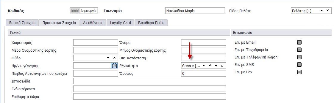 7. Θα πρέπει να συμπληρωθεί η Εθνικότητα (Πελάτες/Διαχείριση/Πελάτες) στην καρτέλα “Προσωπικά Στοιχεία” των Συναλλασσομένων ώστε να γίνει χρήση του κωδικού χώρας από την ΑΑΔΕ.