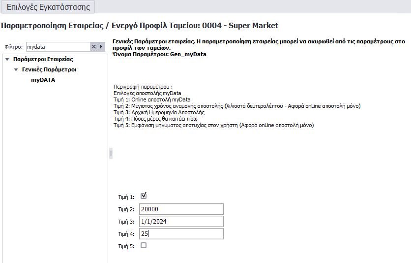 Στην παράμετρο “myData” που βρίσκεται στο μενού Διαχείριση \ Παράμετροι \ Επιλογές Εγκατάστασης \ Παράμετροι Εταιρείας \ Γενικές Παράμετροι \ myData γίνεται η ενεργοποίηση της online αποστολής myDATA.