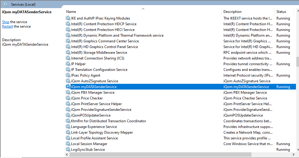 Στην αρχική τοποθεσία της εφαρμογής εκτελείτε το αρχείο iQom.myDATASenderService.exe. Η υπηρεσία εγκαθίσταται στις Υπηρεσίες και στη συνέχεια την πατάτε Εκκίνηση.
