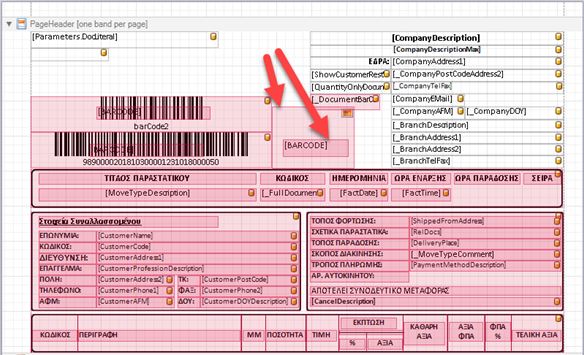 - Αν υπάρχει το QR Code στις αντίστοιχες φόρμες εκτύπωσης. Αν δεν υπάρχει πρέπει να προστεθεί σε όλα τα σημεία από όπου εκδίδονται παραστατικά στο myDATA. Το QR Code το αντιγράφουμε από την default φόρμα της εφαρμογής, μαζί με το πεδίο barcode που είναι στο ίδιο σημείο, όπως φαίνεται στην παρακάτω εικόνα: