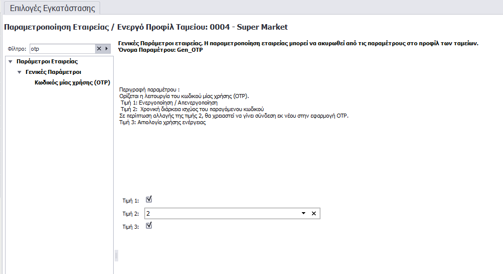 Για την ενεργοποίηση της λειτουργίας του κωδικού μιας χρήσης θα πρέπει να είναι ενεργή η παράμετρος «Κωδικός μίας χρήσης (OTP)» που βρίσκεται στις «Επιλογές Εγκατάστασης».