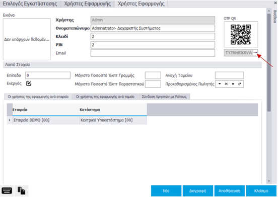 Για να μπορεί κάποιος χρήστης να δίνει κωδικό μιας χρήσης χρειάζεται να παραχθεί μοναδικό QR Code. Το QR Code δημιουργείται μέσα από την καρτέλα του χρήστη (Παράμετροι \ Χρήστες \ Χρήστες Εφαρμογής) στο πεδίο OTP QR είτε εάν πατήσετε τις 3 τελίτσες ή με δεξί κλικ στο κενό πλαίσιο και επιλέξετε Generate. Κάτω από το QR Code δημιουργείται και ο αντίστοιχος κωδικός. Τέλος, πατάτε Αποθήκευση.