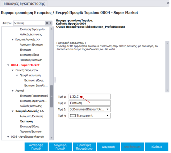 Για να ορίσετε μια ενέργεια να χρειάζεται εισαγωγή κωδικού μιας χρήσης για να ολοκληρωθεί, πρέπει να παραμετροποίηση την τιμή 1 όπως φαίνεται παρακάτω στην παράμετρο «Έκπτωση» (RibbonButton_PrefixDiscount). Το γράμμα C δηλώνει ότι απαιτείται κωδικός μιας χρήσης.