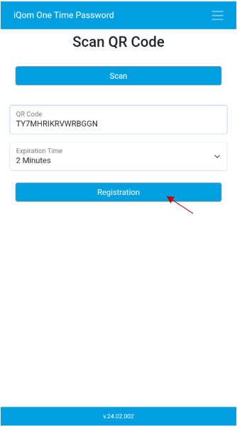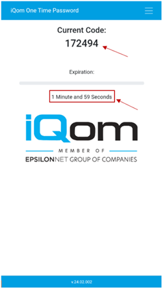Αφού γίνει η εγγραφή του χρήστη στην εφαρμογή iQomOTP, αυτόματα δημιουργείται ο κωδικός μίας χρήσης και εμφανίζεται ο χρόνος που είναι διαθέσιμος ο κωδικός αυτός.
