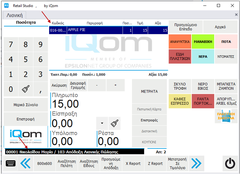 Στη συνέχεια πραγματοποιείτε συναλλαγή στην οθόνη λιανικής με το είδος APPLE PIE[016-00029] και με κάρτα πελάτη που είναι τύπου Κάρτα Πιστότητας[0001].