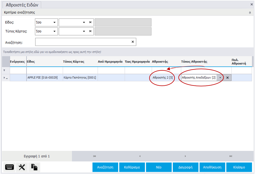 Ακολουθεί ένα παράδειγμα δημιουργίας αθροιστή αποδείξεων για το είδος APPLE PIE[016-00029] με Κάρτα Πιστότητας[0001]. Ο Τύπος Αθροιστή πάντα ορίζεται σε έναν Αθροιστή. Οι αθροιστές είναι τρεις: