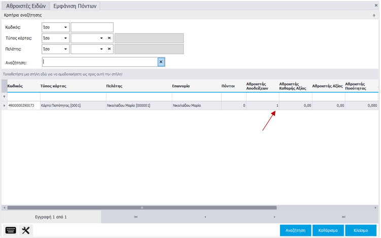 Από το μενού Πωλήσεις \ Κύκλωμα Πιστότητας \ Εμφάνιση Πόντων μπορείτε να δείτε τα στατιστικά των αθροιστών.