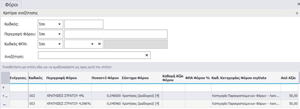Στο μενού Πωλήσεις \ Διαχείριση \ Φόροι είναι δυνατή η δημιουργία παρακρατήσεων.
