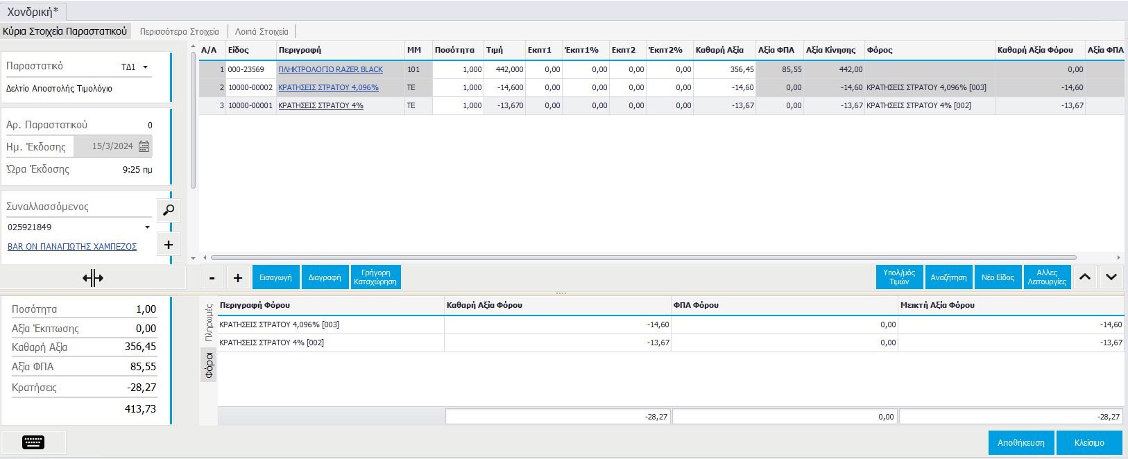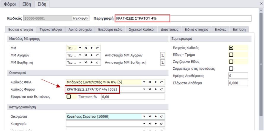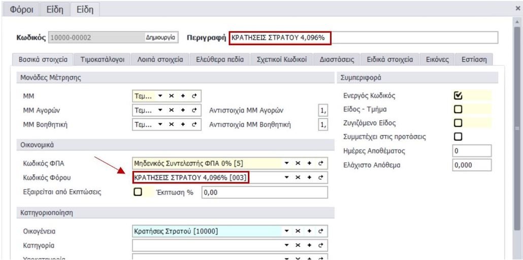 Στη συνέχεια δημιουργείτε δύο είδη και τα συνδέετε με τις παρακρατήσεις. Τα είδη πρέπει να έχουν πάντα ΦΠΑ 0%.