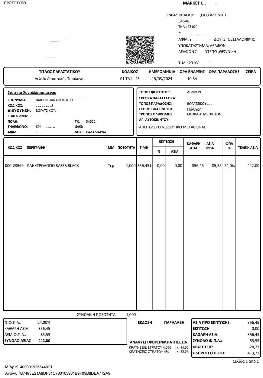 Αφαίρεση παρακρατήσεων από τη μεικτή αξία του παραστατικού -> 442 – 28,27 = 413,73