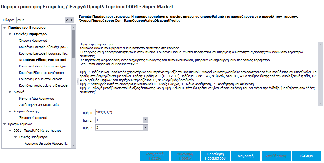 Ακολουθεί παράδειγμα παραμετροποίησης κουπονιού είδους με πρόθεμα 983 και έκπτωση αξίας 0,30 λεπτά.