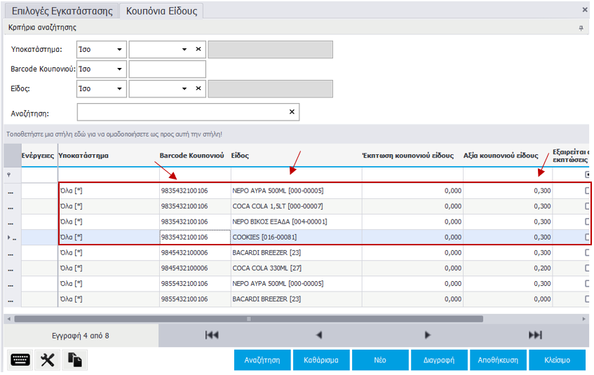 Στη συνέχεια, θα πρέπει να δημιουργήσετε κουπόνια είδους από το μενού «Πωλήσεις \ Διαχείριση \ Κουπόνια Είδους», ορίζοντας το barcode κουπονιού, τα είδη που θα έχουν έκπτωση με αυτό το κουπόνι και είτε την έκπτωση κουπονιού είδους (ποσοστό έκπτωσης) είτε την αξία κουπονιού είδους.