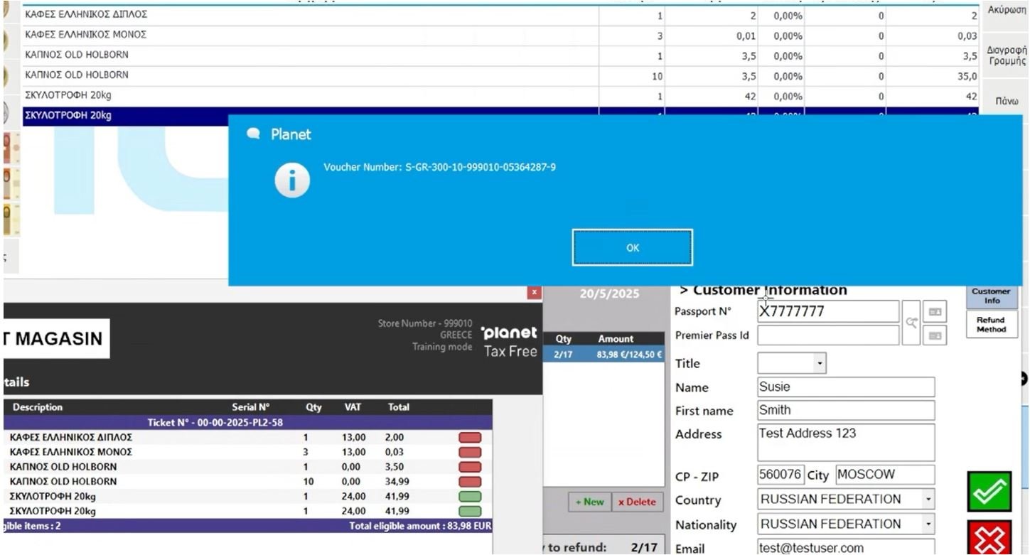 Εφόσον η επικοινωνία με τον πάροχο είναι επιτυχής «σηκώνεται» η εφαρμογή της Planet και εκδίδεται το παραστατικό της υπηρεσίας. Σε περίπτωση μη επικοινωνίας εμφανίζεται αντίστοιχο μήνυμα αποτυχίας επικοινωνίας με τον πάροχο. Στο παράδειγμά μας στο PII φαίνεται ότι τα 83,98 € είναι για επιστροφή.