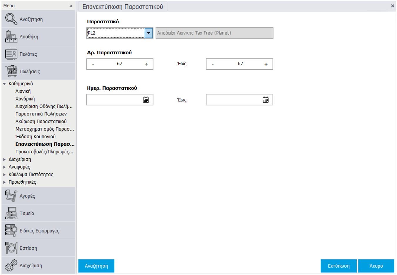 Η επανεκτύπωση παραστατικού γίνεται από το μενού Πωλήσεις \ Καθημερινά Επανεκτύπωση Παραστατικού. Στο πεδίο Παραστατικό επιλέγετε τον κωδικό του παραστατικού και στο πεδίο Αριθμός Παραστατικού συμπληρώνετε τον αριθμό του παραστατικού που θέλετε να επανεκτυπώσετε. Το πεδίο Ημερομηνία Παραστατικού είναι προαιρετικό. Τέλος, πατάτε το κουμπί Εκτύπωση.