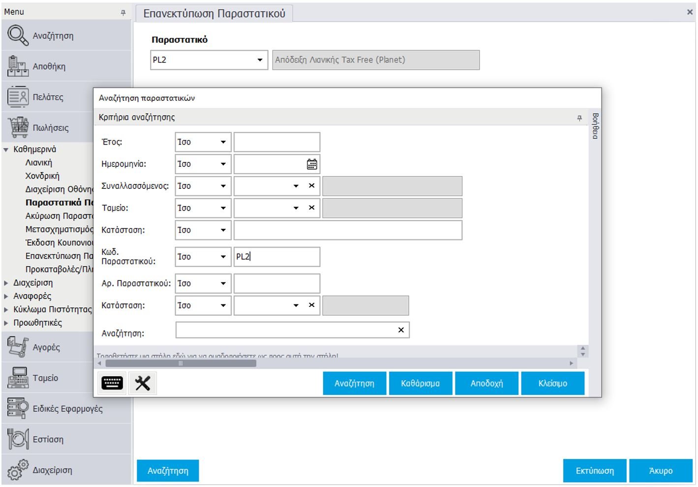Επίσης, μπορείτε να αναζητήσετε το παραστατικό που θέλετε να επανεκτυπώσετε, συμπληρώνοντας οποιοδήποτε κριτήριο αναζήτησης και πατώντας το κουμπί Αναζήτηση.