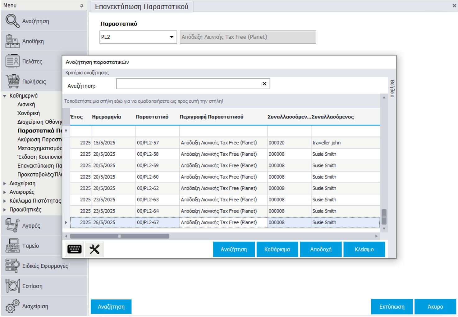 Κατά την έκδοση παραστατικού Planet Tax Free εμφανίζεται μήνυμα για επιλογή πελάτη.