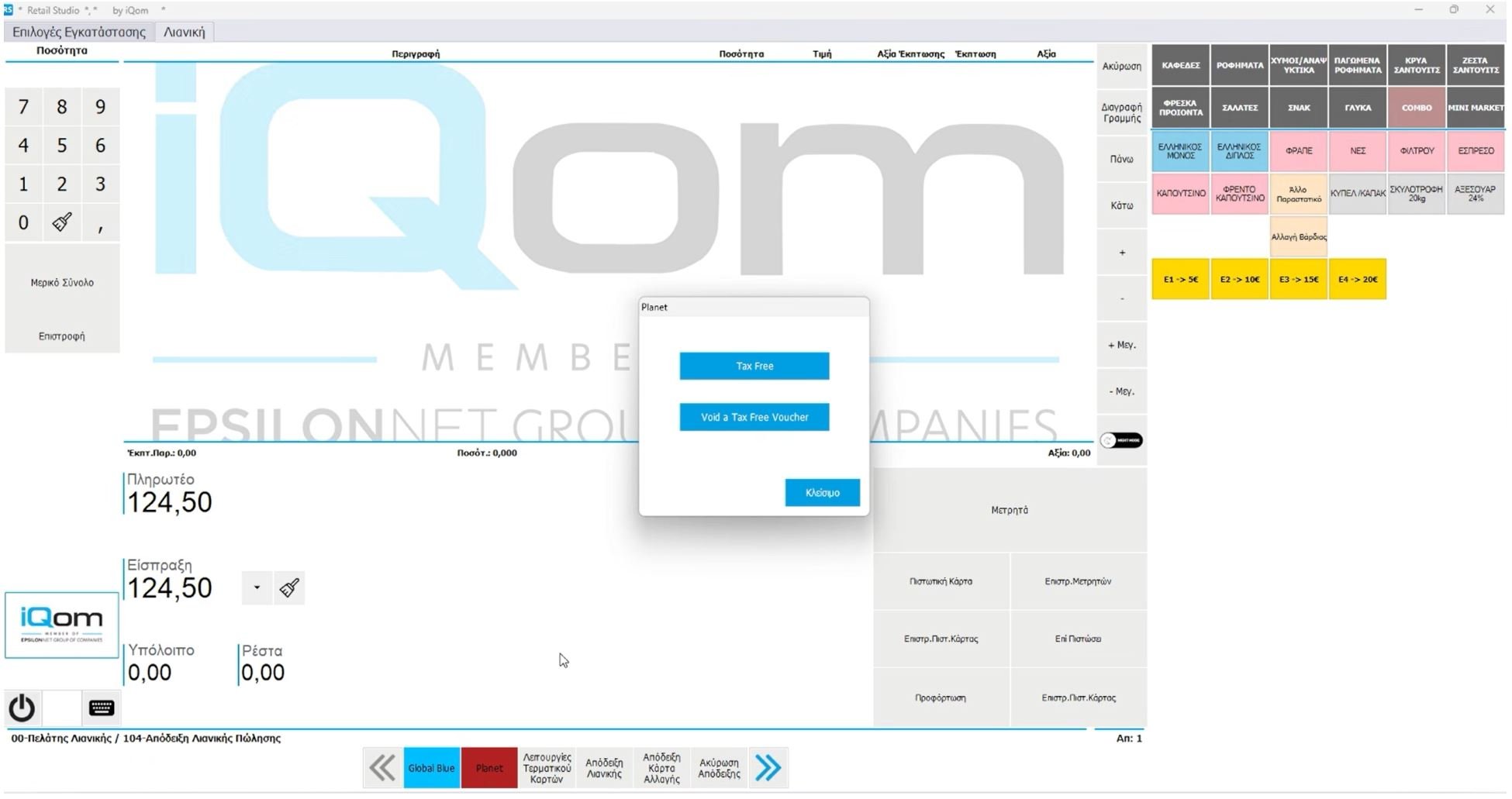 Στην οθόνη λιανικής θα πρέπει να εμφανιστεί το αντίστοιχο κουμπί για την έκδοση παραστατικού Planet TaxFree. Το κουμπί ενεργοποιείται από τις Επιλογές Εγκατάστασης από την παράμετρο Planet (RibbonButton_TaxFreePlanet).