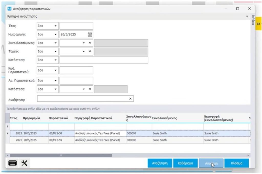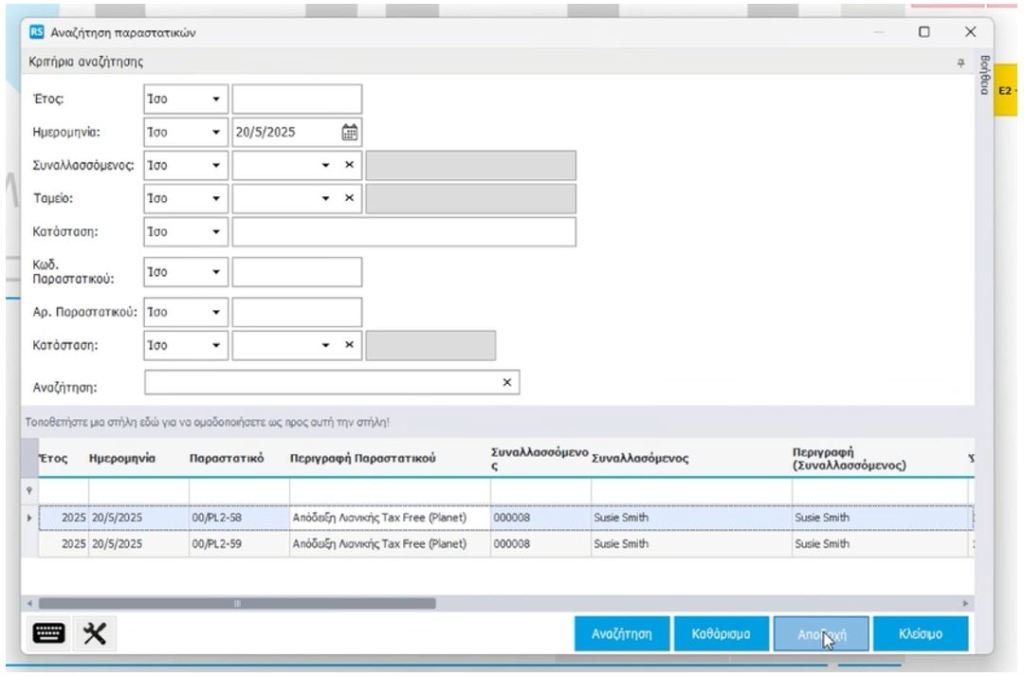 Επίσης, μπορείτε να αναζητήσετε το παραστατικό που θέλετε να επανεκτυπώσετε, συμπληρώνοντας οποιοδήποτε κριτήριο αναζήτησης και πατώντας το κουμπί Αναζήτηση.