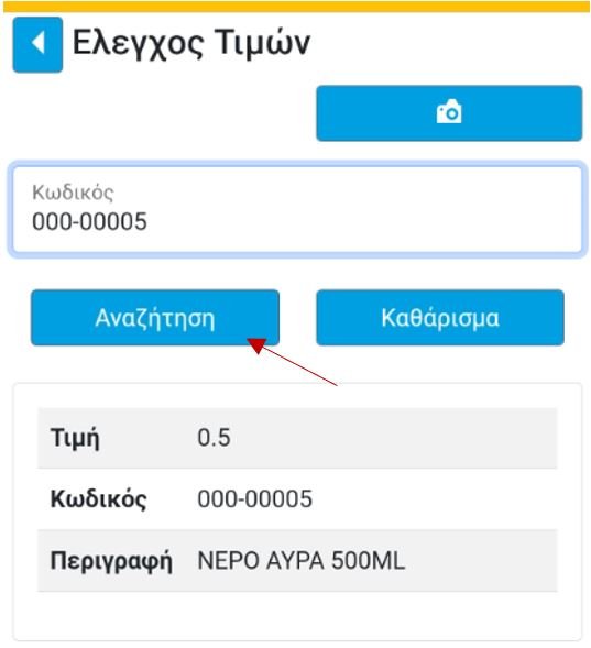 Το μενού «Έλεγχος Τιμών» είναι διαθέσιμο για να ελέγχετε τις τιμές των ειδών. Μπορείτε να σκανάρετε το είδος ή να πληκτρολογήσετε τον κωδικό του και με το κουμπί Αναζήτηση εμφανίζονται η τιμή, ο κωδικός και η περιγραφή τους είδους.
