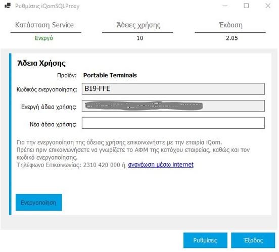 Από την αρχική τοποθεσία εγκατάστασης της εφαρμογής εγκαθιστάτε την υπηρεσία iQomSQLProxyService με διπλό κλικ στο iQomSQLProxy.exe. Αφού γίνει η εγκατάσταση της εφαρμογής ενεργοποιείτε νέα άδεια χρήσης.