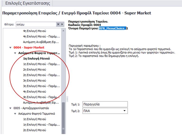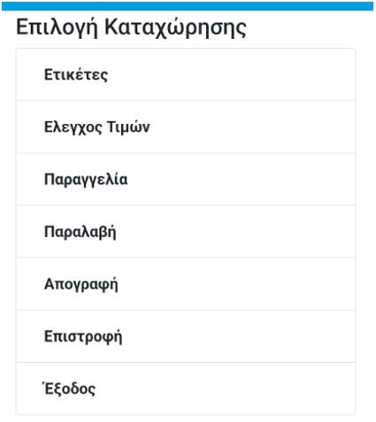 Τα μενού Ετικέτες και Έλεγχος Τιμών εμφανίζονται πάντα, όπως και η επιλογή Έξοδος. Τα υπόλοιπα μενού ορίζονται από το RetailStudio στις Επιλογές Εγκατάστασης από τις παραμέτρους RFN_MenuChoice_*.