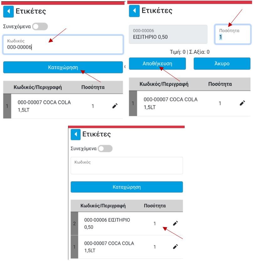 Με το κουμπί της κάμερας μπορείτε να σκανάρετε το barcode είδους και τέλος με το κουμπί Καθάρισμα, καθαρίζει το πεδίο του κωδικού.