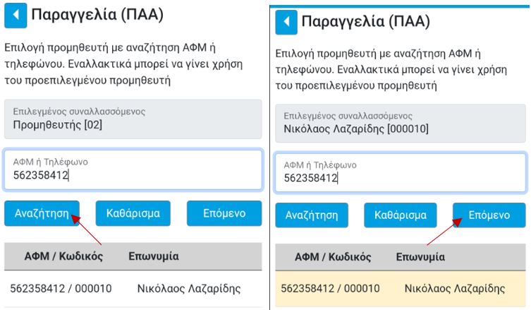 Στο μενού Παραγγελία εμφανίζεται στο πάνω μέρος ο κωδικός παραστατικού (π.χ. ΠΑΑ). Μπορεί να επιλεχθεί κάποιος προμηθευτής είτε με αναζήτηση ΑΦΜ ή τηλεφώνου. Εναλλακτικά, μπορεί να γίνει χρήση του προεπιλεγμένου προμηθευτή και στη συνέχεια να αλλάξει από την εφαρμογή RetailStudio. Έστω για παράδειγμα ότι θέλετε να βρείτε τον συναλλασσόμενο με ΑΦΜ 562358412. Πληκτρολογείτε το ΑΦΜ στο κενό πεδίο, πατάτε Αναζήτηση και εμφανίζεται ο προμηθευτής. Τον επιλέγετε ώστε να κιτρινίσει το πλαίσιο και πατάτε Επόμενο.