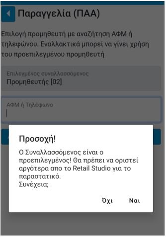 Στη συνέχεια, αφού επιλεχθεί προμηθευτής, μπορείτε να σκανάρετε τα είδη για παραγγελία με τον ίδιο τρόπο που αναφέρθηκε στο μενού «Ετικέτες». Για να οριστικοποιηθεί το παραστατικό και να εμφανιστεί στο RetailStudio πρέπει να πατηθεί το κουμπί Οριστικοποίηση.
