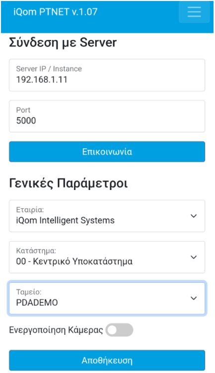 Πατάτε Επικοινωνία και εφόσον η σύνδεση είναι επιτυχής εμφανίζονται οι Γενικές Παράμετροι με συμπληρωμένα τα πεδία Εταιρεία, Κατάστημα και Ταμείο που «διαβάζονται» από τη βάση δεδομένων. Σε περίπτωση που θέλετε να ενεργοποιήσετε τη λειτουργία της κάμερας, αυτή ενεργοποιείται από το πεδίο «Ενεργοποίηση Κάμερας».
