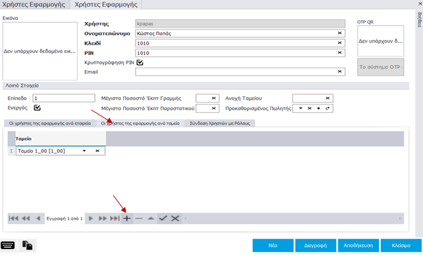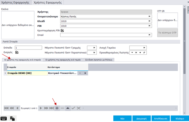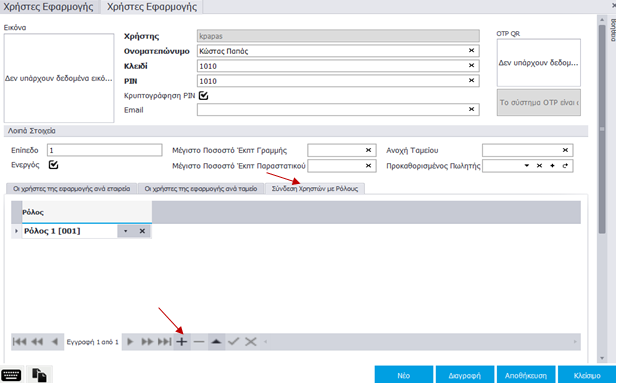 Έχει δημιουργηθεί ο χρήστης και με διπλό κλικ εμφανίζεται η καρτέλα του, όπου μπορείτε να συνδέσετε τον χρήστη με Εταιρία, Κατάστημα, Ταμείο και Ρόλο.
