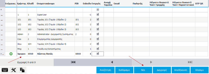 Από το μενού Διαχείριση \ Παράμετροι \ Χρήστες\ Χρήστες Εφαρμογής, επιλέγετε το κουμπί ‘Νέο’ ώστε να δημιουργηθεί καινούρια εγγραφή.
