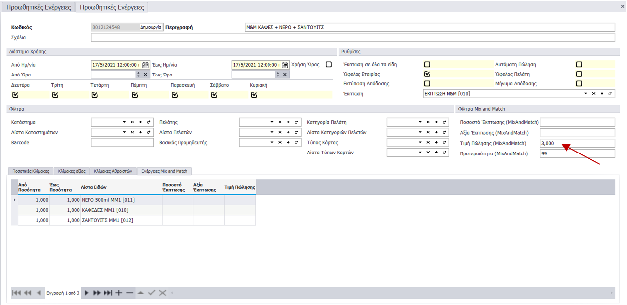 Εάν πουληθούν μαζί, ένα είδος από την Λίστα Ειδών «ΝΕΡΟ 500ml ΜΜ1[011]», ένα είδος από την Λίστα Ειδών «ΚΑΦΕΔΕΣ ΜΜ1[010]» και ένα είδος από την Λίστα Ειδών «ΣΑΝΤΟΥΙΤΣ ΜΜ1[012]» τότε η Τιμή Πώλησης για αυτά τα είδη να είναι 3 ευρώ.