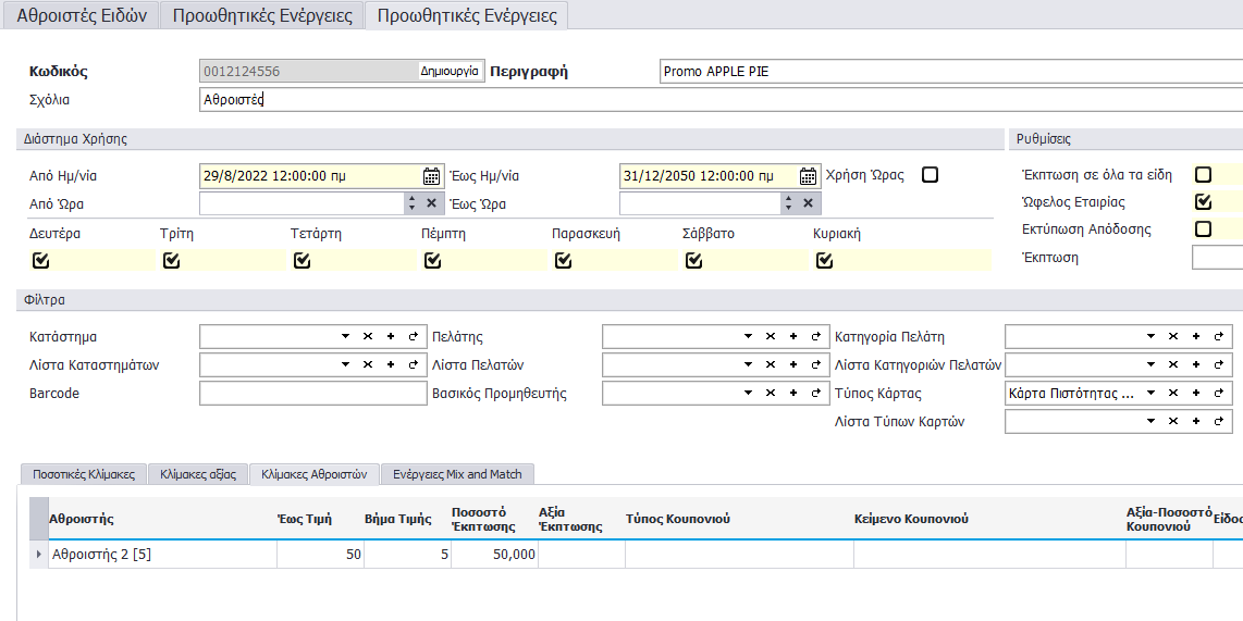 • Αξία Έκπτωσης (MixAndMatch): Ορισμός αξιακής έκπτωσης που αφορά την προωθητική